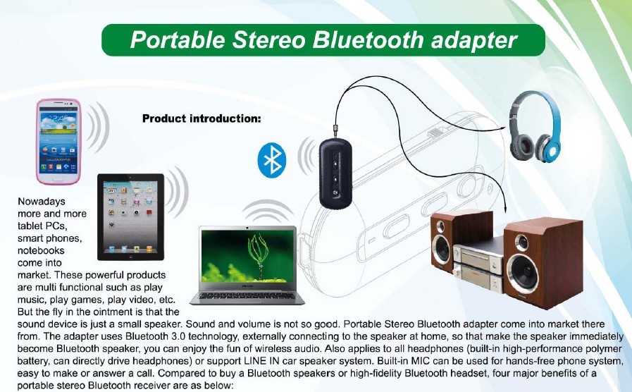 它不简简单单只做蓝牙耳机使用,还是一款高性价比的蓝牙立体声音频接收装置,可以搭配蓝牙立体声音发射器或笔记本蓝牙实现室内无线高保真音频传输,可做音箱的配件,只需把耳机头拔出来连接在普通音箱音频输入插头处,普通音响马上摇身变成高档的蓝牙音箱!解除了连线对用户的束缚,使用户可以在室内任意位置享受蓝牙立体音乐而不必将音源设备放置在音箱1米以内的范围。可省去音响插线不够长,音箱摆放位置不方便等诸多烦恼!灵活便捷方便,不插就是普通的音箱,插上就成了带蓝牙通话功能的音箱,有了它不用刻意去设计生产新款的蓝牙音箱。